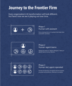The WTI outlines three phases in the evolution toward Frontier Firms: (1) humans with AI assistants; (2) human–agent teams; (3) human-led, agent-operated systems.